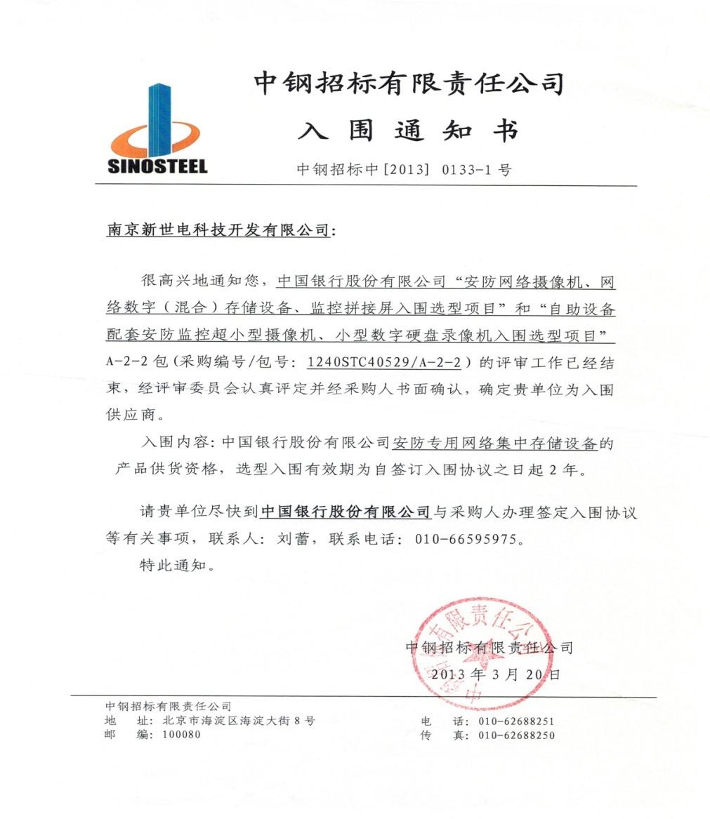 2013年3月20日,公司接到中國銀行總行通知,新世電在中國銀行股份有限公司“安防網絡攝像機、網絡數字(混合)存儲設備、監控拼接屏入圍選型項目”和“自助設備配套安防監控超小型攝像機、小型數字硬盤錄像機入圍選型項目”A-2-2包(采購編號/包號1240STC40529/A-2-2)的競爭性談判采購中,經評審委員會認真評定并經采購人書面確認,確定新世電為入圍供應商,入圍內容:中國銀行股份有限公司安防專用網絡集中存儲設備的產品供貨資格,選型入圍有效期為自簽訂入圍協議之日起2年。