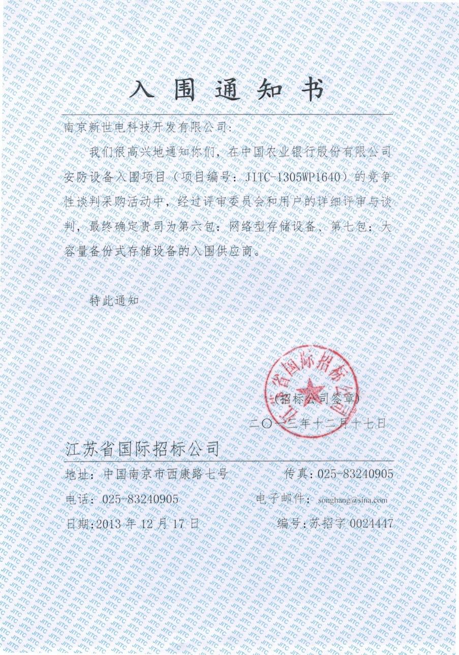 2013年12月17日,公司接到中國農業銀行總行通知,新世電在中國農業銀行股份有限公司安防設備入圍項目(項目編號:JITC-1305WP1640)的競爭性談判采購中,經評審委員會和用戶的詳細評審與談判,最終確定新世電為第六包:網絡型存儲設備、第七包:大容量備份式存儲設備的入圍供應商。